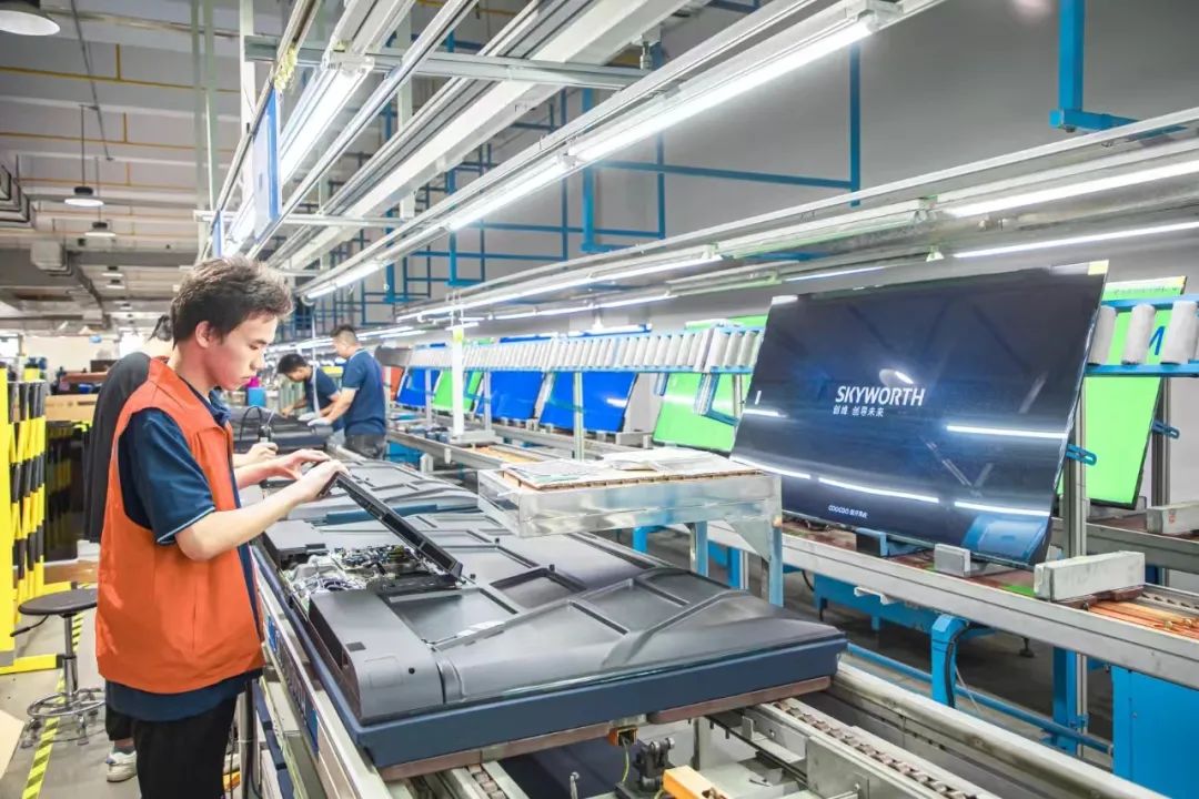 创维平面显示科技有限公司流水线工人正在组装电视机零件。