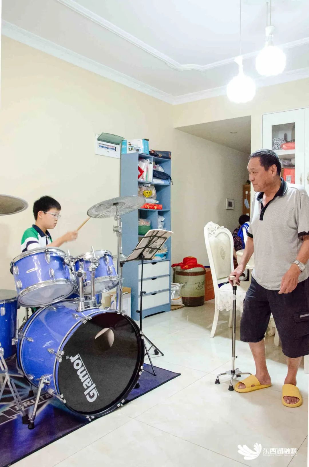 记者走进李爹爹家门看到,他正杵着四角拐杖站在客厅里,满脸笑容地看着孙子打架子鼓。