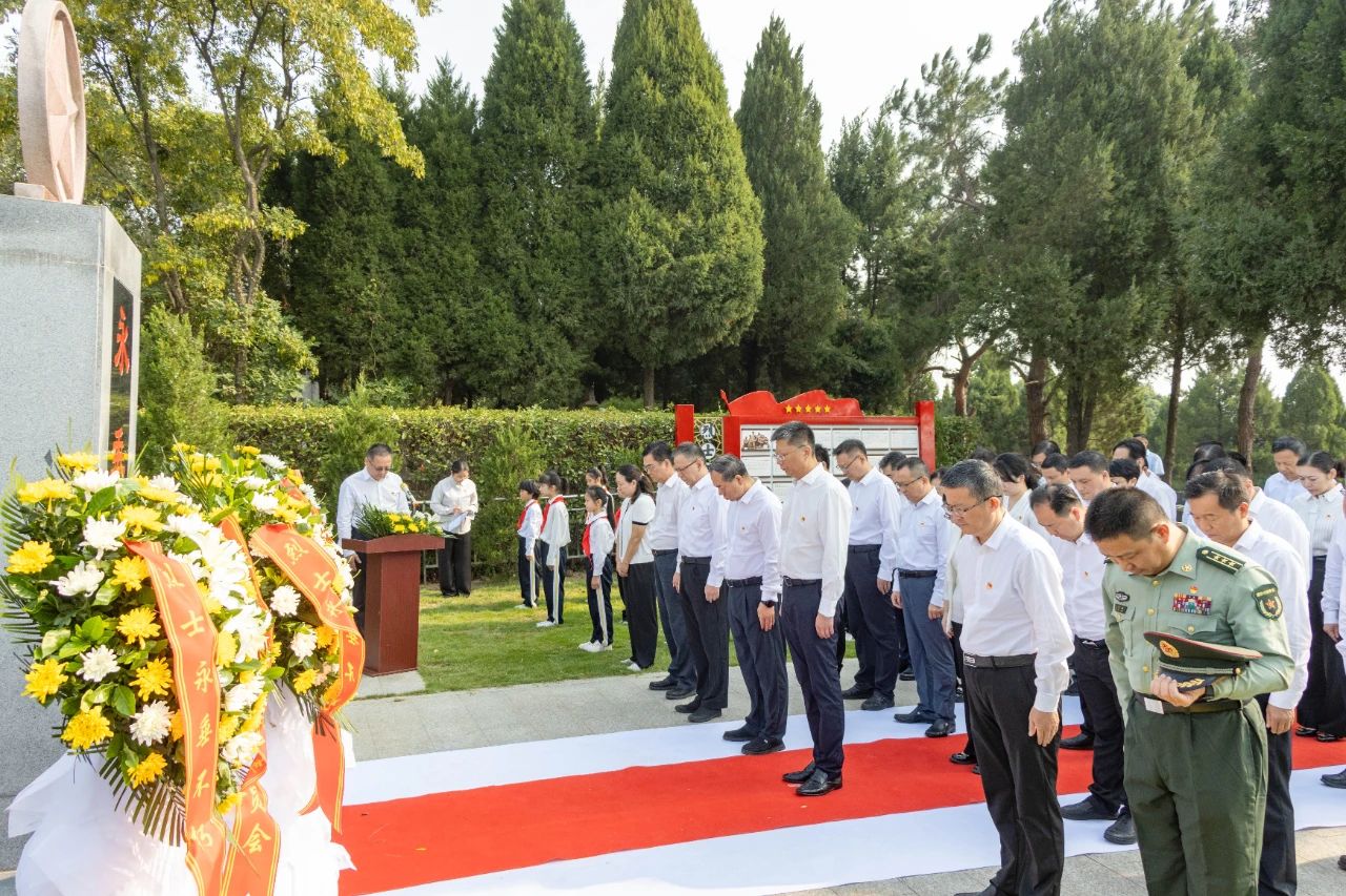 现场奏唱中华人民共和国国歌,全体人员在烈士纪念碑前肃穆站立,向为中国人民解放事业和共和国建设事业英勇献身的烈士垂首默哀。