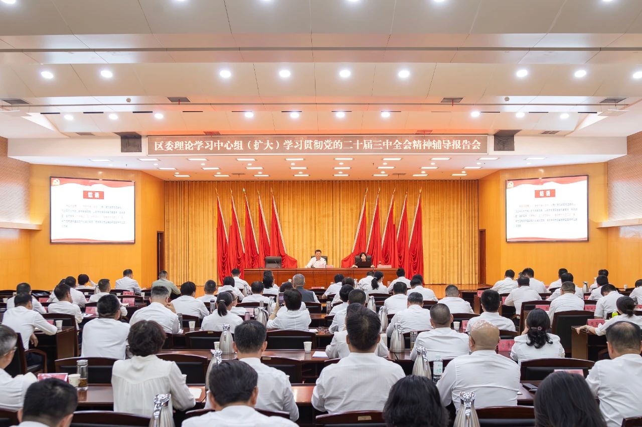 10月11日,区委理论学习中心组(扩大)学习贯彻党的二十届三中全会精神辅导报告会举行。区委书记彭涛主持并讲话,区政协党组书记、主席刘华强,区委副书记、政法委书记段红波出席报告会。