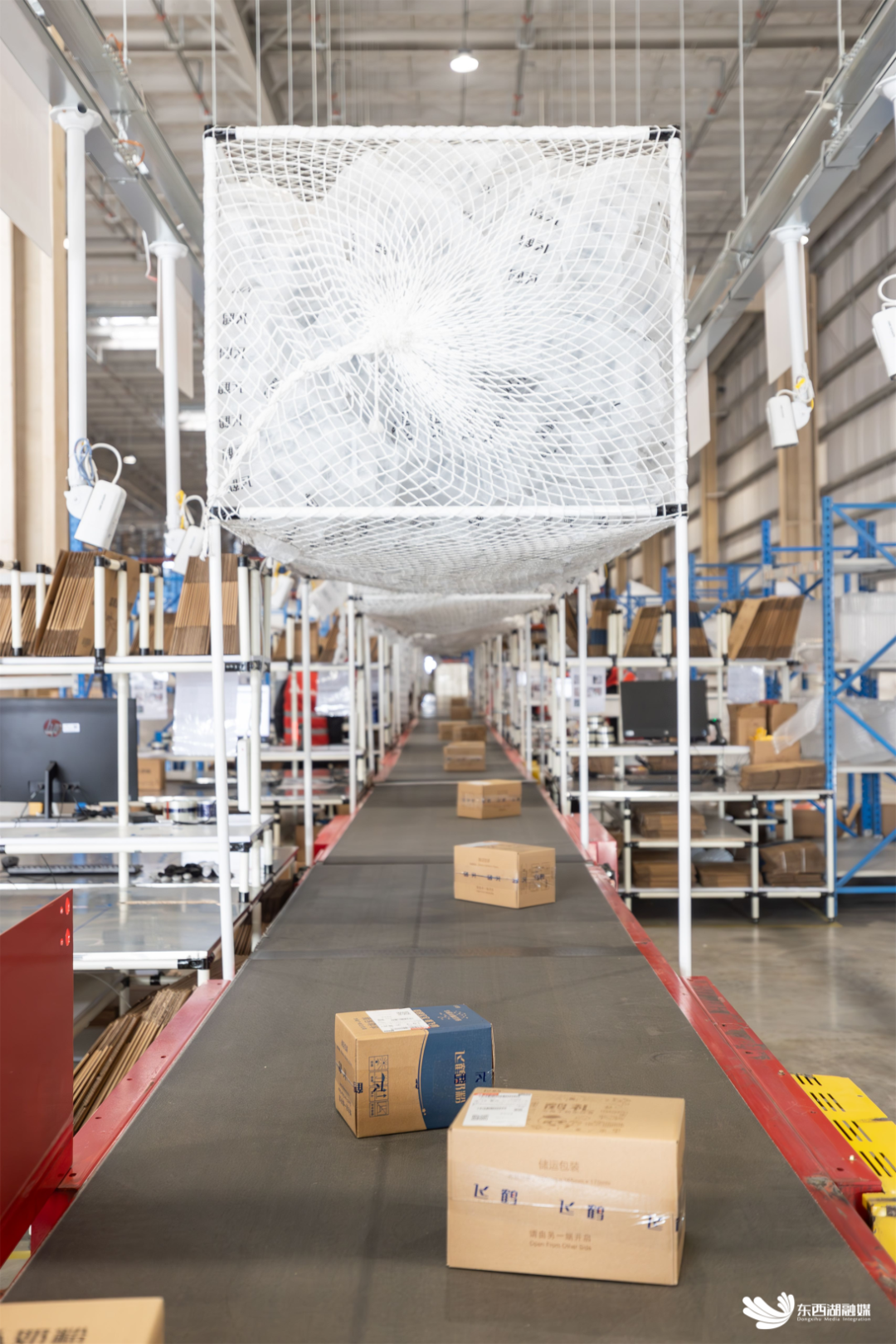 分拣好的货品通过传送带输送。