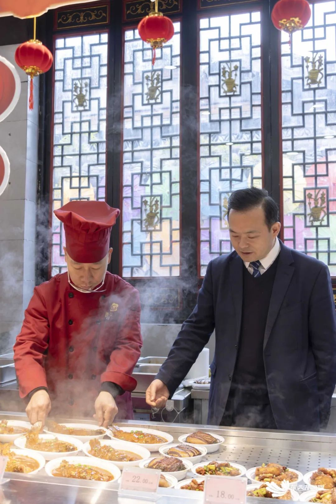 记者看到,明亮通透的厨房里,6名厨师正在热气腾腾的锅炉上烹饪,菜品出锅后,被装至一个个小碗里,摆至保温售卖台供游客选择。小碗菜价格定位从7元到48元不等,最低21元便可体验3道武汉名菜。