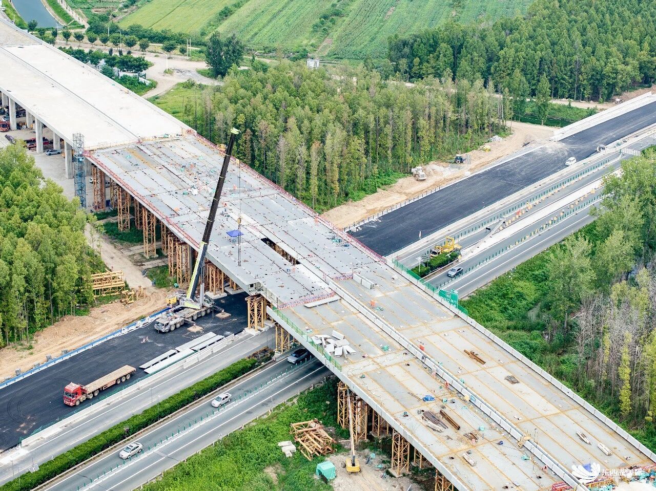 “最大跨径达80米,钢箱梁吊装总重量高达3800吨,且需在不中断京港澳高速通行的情况下进行作业。”区城发投集团项目代表罗丹回忆道,面对深基坑、高支模、跨高速施工等多重挑战,建设者们将整联钢箱梁横向划分为8个节段、共计32段钢梁,采用分节制作、现场焊接拼装的方式,利用夜间高速车流低谷期进行精准吊装,成功推动跨线桥实现全线贯通。