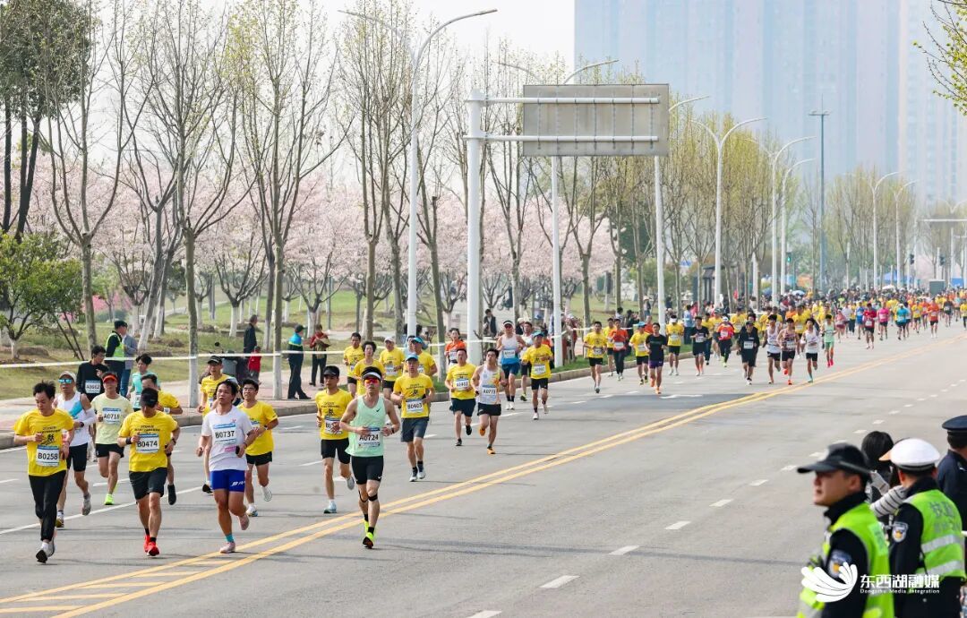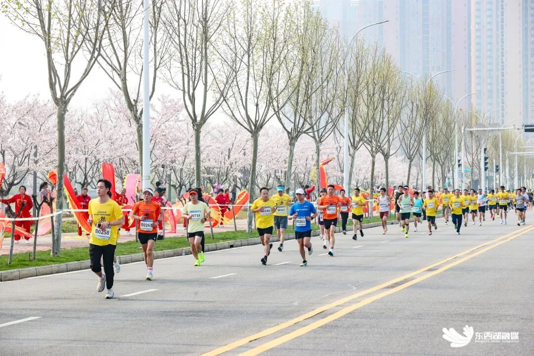 赛道全程有8公里生态绿廊,绿化覆盖率达75%,串联三大生态地标。沿路樱花、海棠、紫叶李等竞相绽放,其中中央明渠段就植有千余株樱花树,形成绵延数公里的花漾跑道,跑者移步换景,尽览滨水风光与春日盛景。