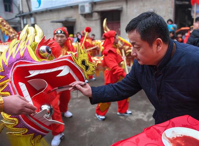 村里两位德高望重长者站定,手握毛笔,蘸取备好的鸡血酒。曾宪刚高呼:一点天庭,迎春接福开彩门;二点双目,风调雨顺;三点口粒,五谷丰登;四点头尾,族人安居乐业享太平。