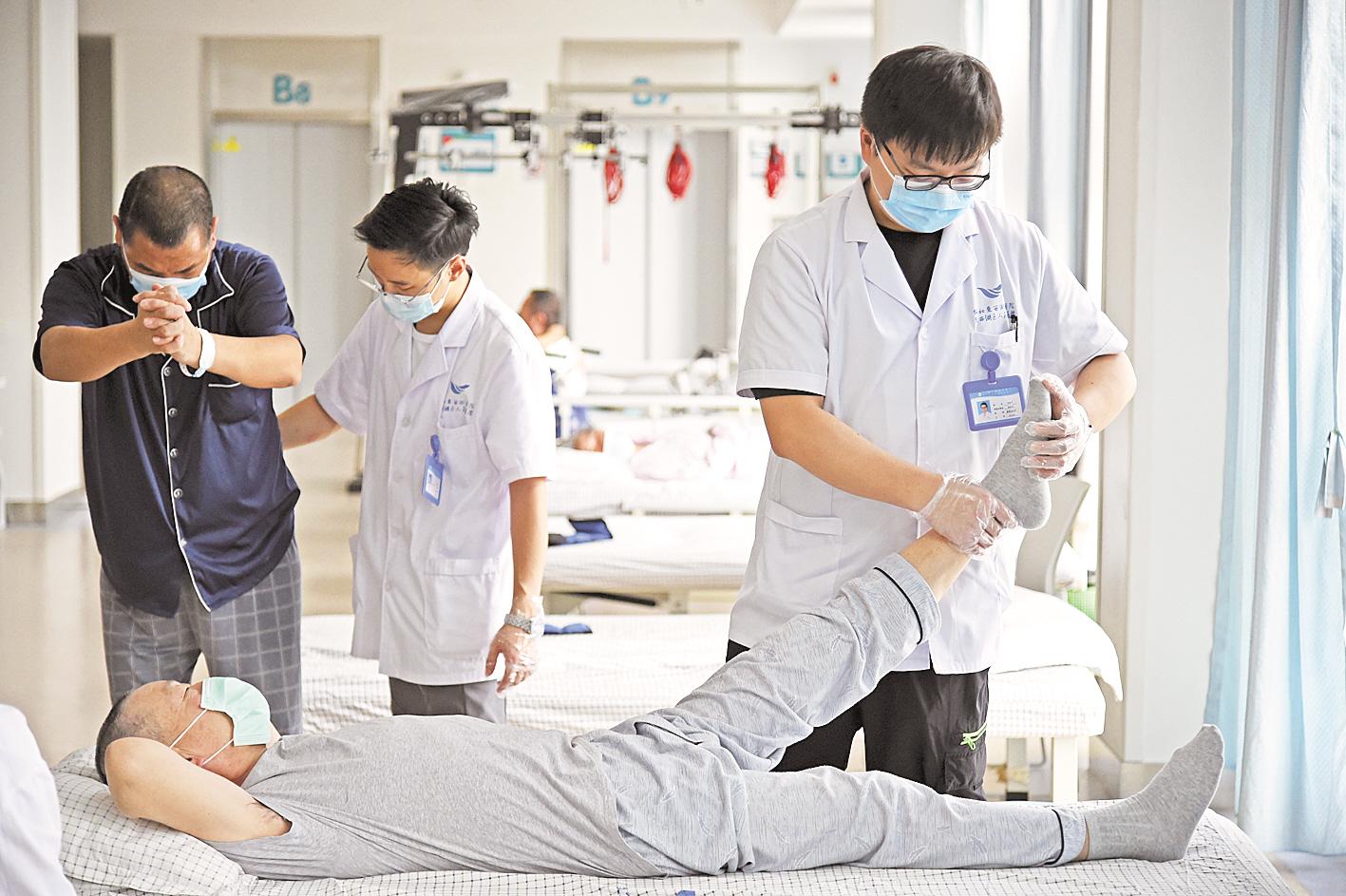 6月29日,协和东西湖医院康复科医护人员指导患者进行康复训练。 (湖北日报全媒记者 倪娜 通讯员 游乐 摄)