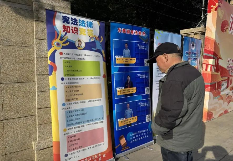 在普法展板区域,群众通过参与现场法律知识问答以及学习法律相关政策,在获得相关法律知识的同时也收获了各单位准备的法治水杯、法治日历、法治围裙等“法治大礼包”。