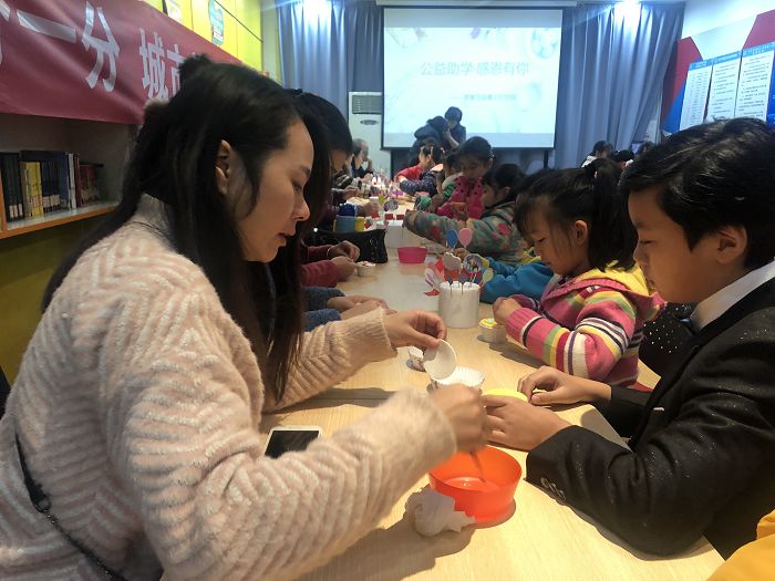 在烘焙老师的指导下,受资助的小朋友认真完成每一个步骤,还相互交流生活上的趣事、学习中遇到的问题。