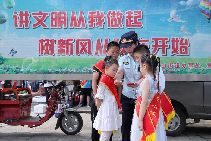 本报讯 (记者徐卉婷 通讯员 王少勇)10名佩戴“文明小城管”绶带的小朋友来到街面认真巡查,摊主见状赶紧调整不文明行为。6月1日,东山街城管所协管员子女们担任的“娃娃城管”,让大人们无法说“不”。