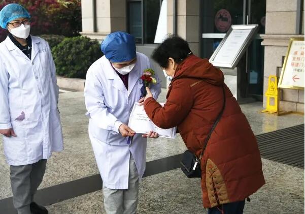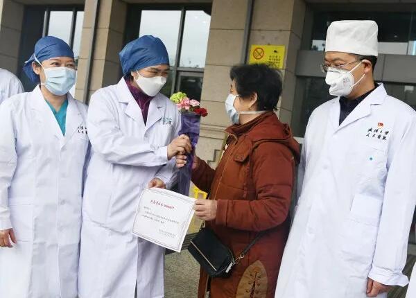 3月16日,在武汉大学人民医院东院区住了45天的患者、63岁的谢大姐出院了,欢送她出院的有国家卫健委高级别专家组成员李兰娟院士,还有该医院的副院长江应安。