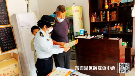 在东山集镇李姓商户的餐饮店内,执法队员将汛期燃气安全使用手册发放到商户手中,并现场向商户讲解汛期燃气安全使用常识。