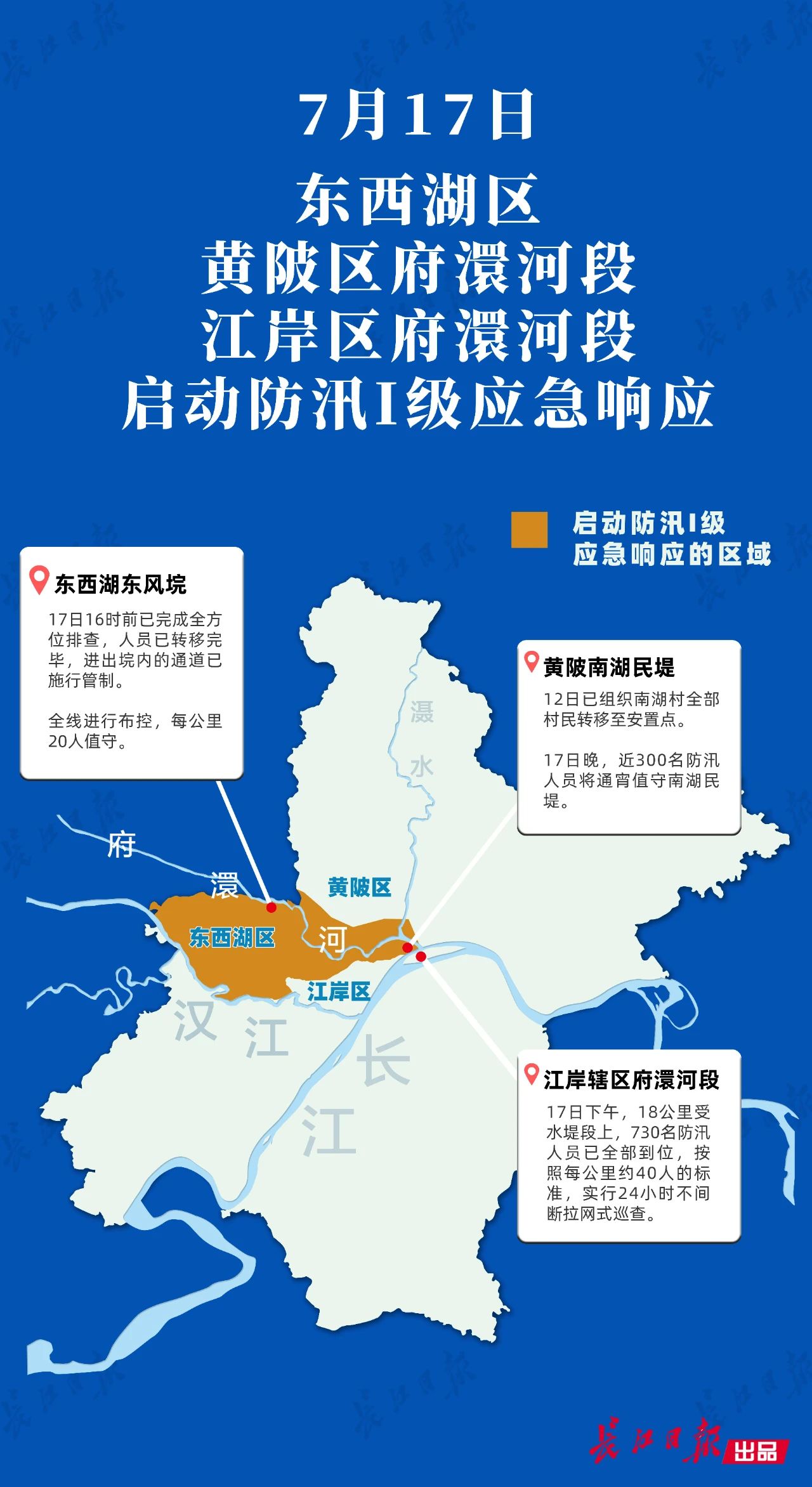 当天下午,东西湖区防汛抗旱指挥部根据市防指要求,发出通知,自7月17日13时起,将防汛应急响应等级由Ⅱ级提升至Ⅰ级。