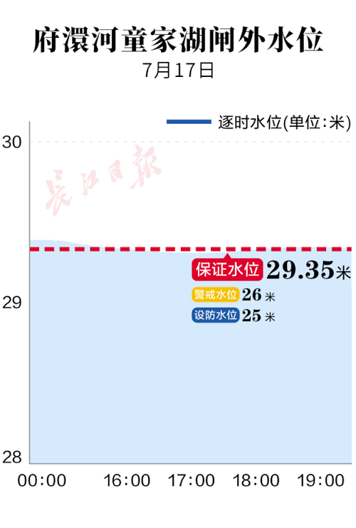 17日19时,河道水情监测数据显示,府澴河童家湖闸外水位达到29.41米,超保证水位0.06米。