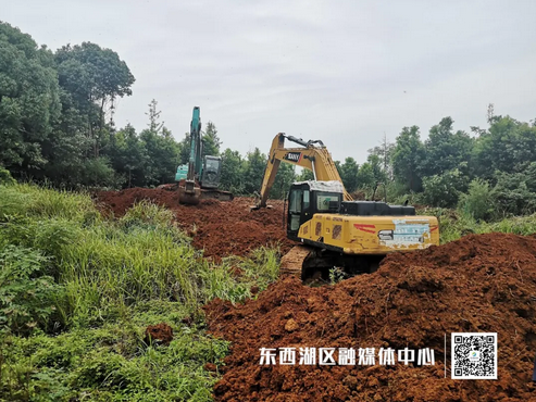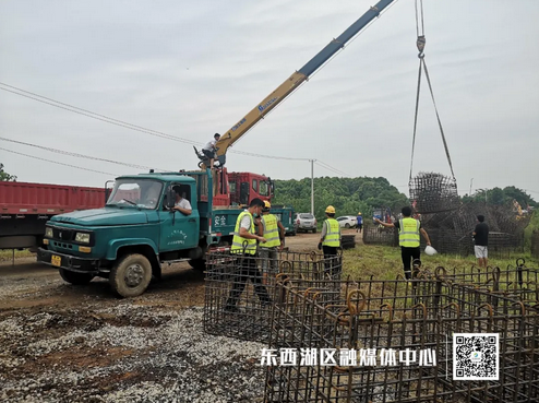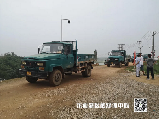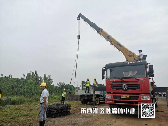 17日16时左右,位于东西湖区柏泉街北湖大队的东西湖防汛抗旱指挥部东山分指挥部外,巨大的黄色吊车将一个个钢筋网兜、钢筋笼码置在黄土堆旁,距离东风垸堤不足50米。这里是东风垸北湖闸口段,也是东风垸的3处险段之一。