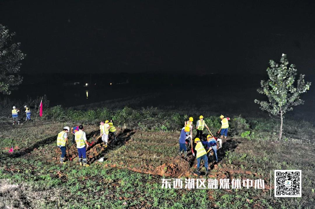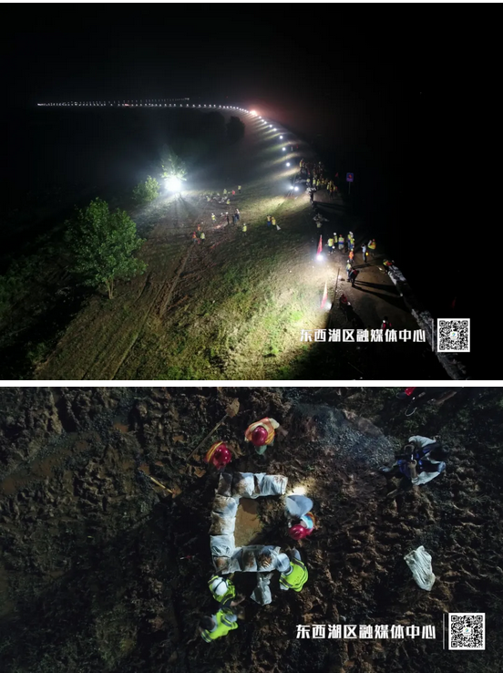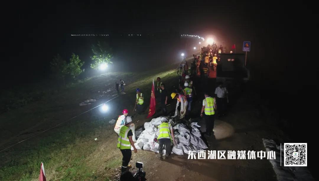 当晚,北湖闸口不远处出现一处散浸,一支由中建三局建筑工人组成的防汛突击队迅速集结到达现场,根据协商方案,开挖人字沟渠,引水流出,一袋袋早已装好的沙袋,源源不断地运往现场,堵住出水点。