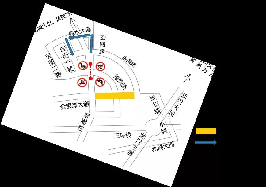 1、往盘龙大桥、黄陂方向车辆可以绕行金潭路—宏图路—碧水大道—宏图一路—金潭路—盘龙大桥;