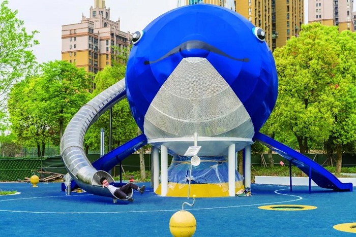 新建的“大鱼乐园”儿童游乐区,设置了9组儿童游乐设施,包括一个高6米的鲸鱼大滑梯,以及4个小滑梯。还有梅花桩、跷跷板、小蹦床、沙坑等等。