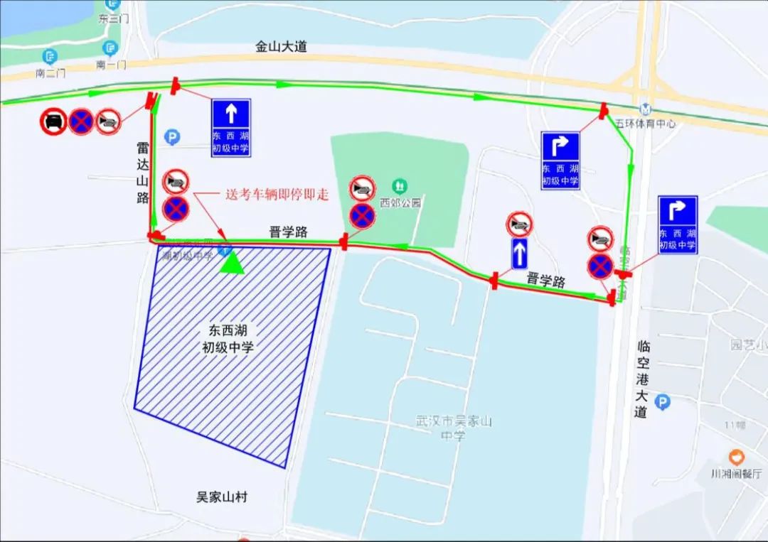 1、每日7:00-9:00、13:30-14:30,雷达山路(金山大道至晋学路)、晋学路,实行单向通行,车辆由临空港大道——晋学路——雷达山路——金山大道单循环通行,送考车辆即停即走,前往五环体育中心停车场停放。