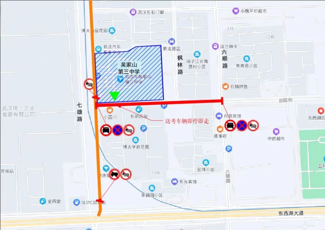 1、每日7:00-9:00、13:30-14:30,田园街(六顺路至七雄路)禁止机动车停放,送考车辆即停即走。