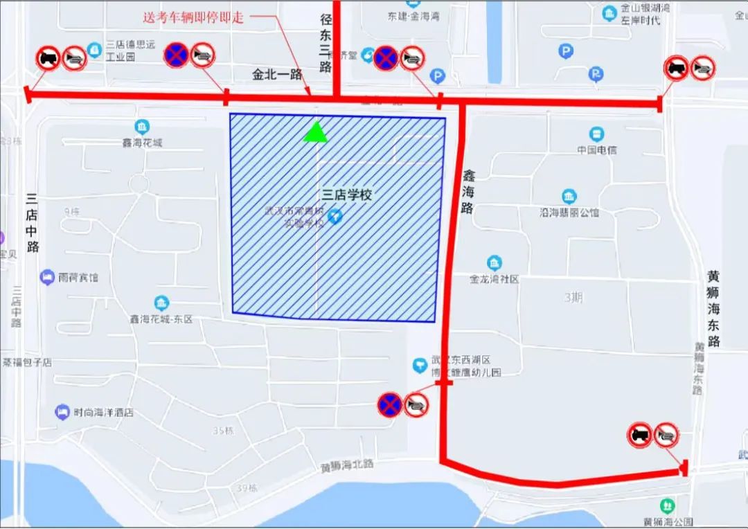 1、每日7:00-19:00,金北一路(黄狮海东路至三店中路)、鑫海路、径东三路禁止货车通行。送考车辆即停即走。