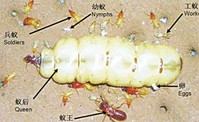 白蚁俗称“白蚂蚁”“无牙老虎”,是世界性“五大害虫”之一,喜在阴暗潮湿环境里生存,偏好啃食纤维素,它会侵蚀房间内的木门框、地板、木制家具、书籍、衣物,分泌的蚁酸甚至能腐蚀钢筋、电缆等,进而对房屋住用安全构成一定影响。白蚁“家庭”由蚁王、蚁后、兵蚁、工蚁、繁殖蚁组成,蚁王、蚁后负责繁衍后代,兵蚁抵御外界的侵扰,而工蚁担负着外出取食回家抚喂幼蚁、蚁王、蚁后、兵蚁的重任,是造成危害的“主力军”。
