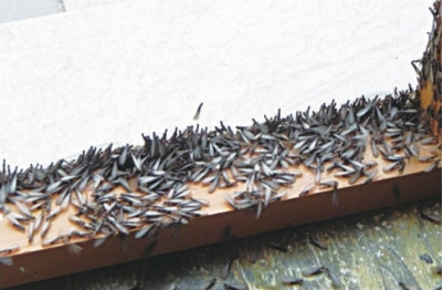 居民在家中发现存在蚁路或发生疑似白蚁分飞现象后,可通过比对白蚁繁殖蚁形态特征,辨识所见虫害是否为白蚁,并对飞出的繁殖蚁和蚁患部位拍照留存,以便指引专业人员准确判别和施治。同时,不必太过紧张和担忧,飞出的繁殖蚁既不会叮咬人也不会传播疾病,落地后会很快脱去翅膀,可按以下步骤先行处理:一是采取拍、打等方式扑杀飞出的繁殖蚁,清扫归拢到垃圾桶后,再用开水淋烫或杀虫剂喷洒处理;二是仔细找寻繁殖蚁飞出的分飞孔(一般在门框之上或台阶、踢脚线等隐蔽部位)并用不干胶封闭,或在其下方放置一盆清水,将再次飞出的部分繁殖蚁予以淹灭。但切忌在分飞孔附近使用杀虫剂,以免惊扰蚁群转移,影响专业人员后期施治效果。