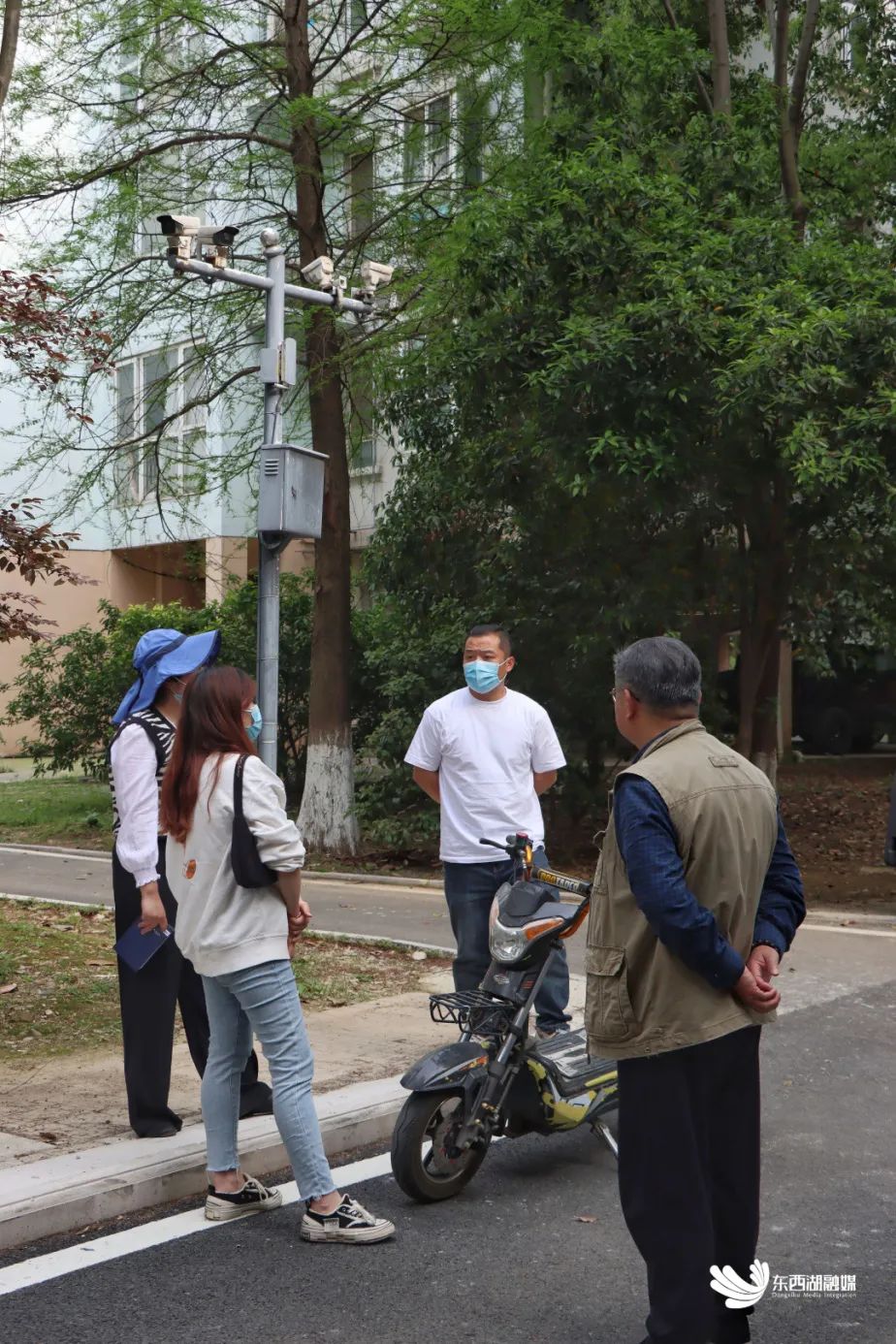 社区工作人员、党员代表、业委会和物业人员正在电梯施工现场协商
