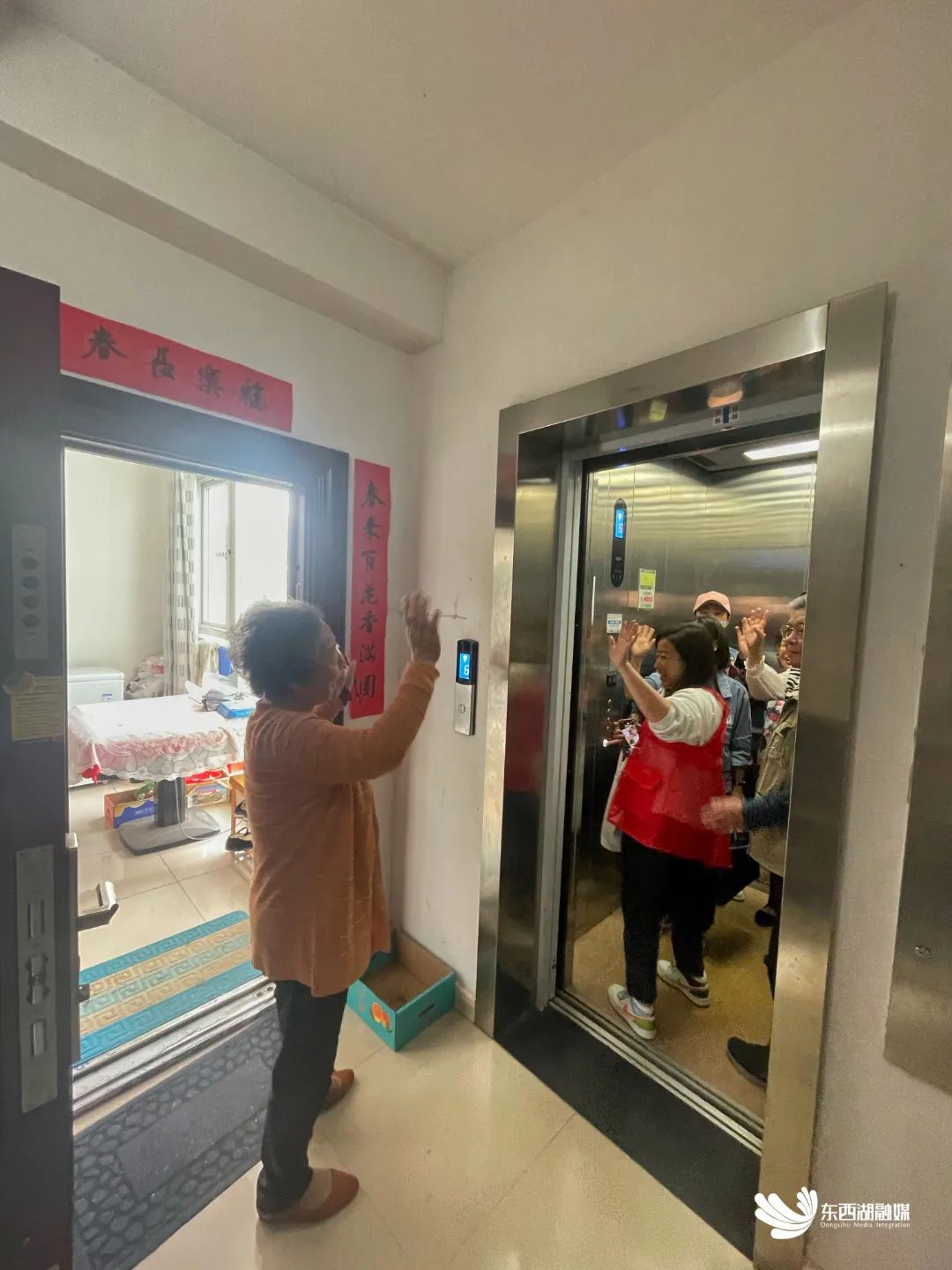 邱荣芬老人正在与上门探望社区工作人员告别
