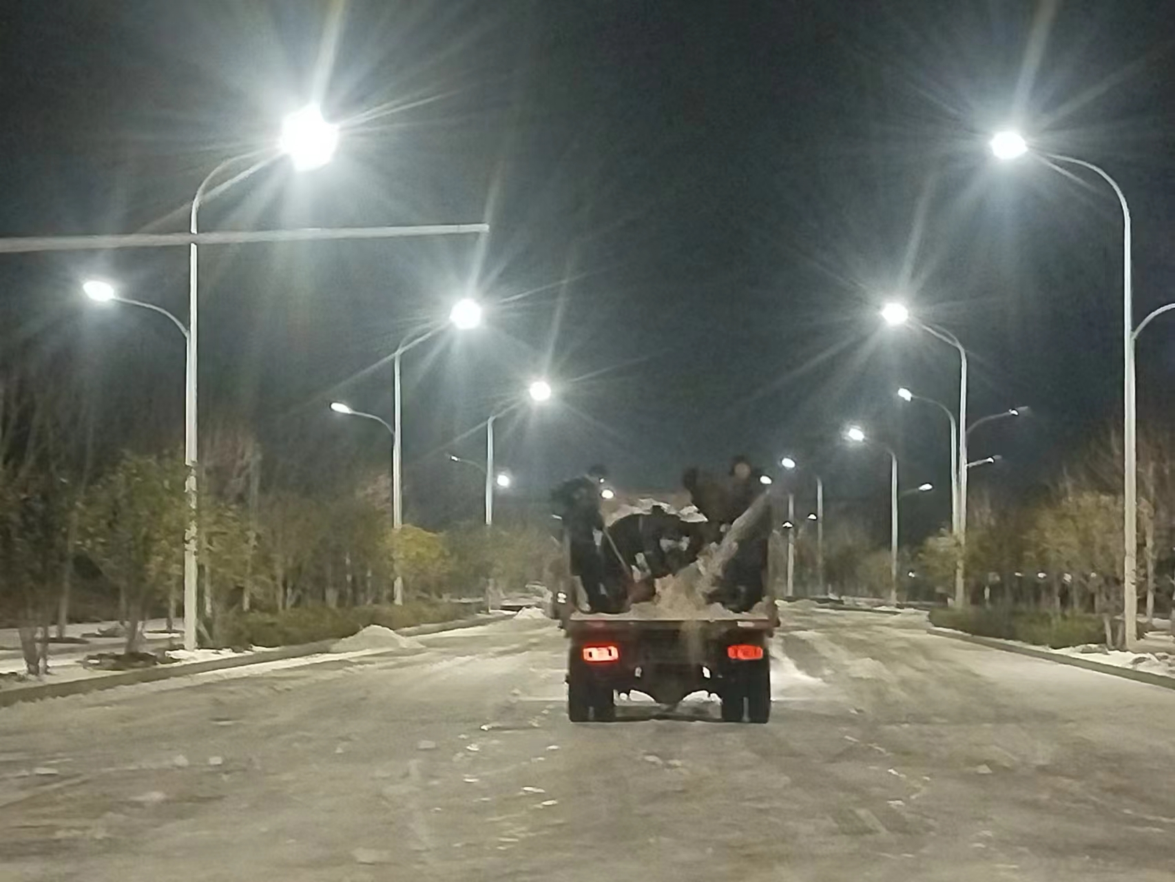 新沟镇街禧洁环卫公司加强夜间撒盐、铲雪作业,公司党员突击队在革新大道、东吴大道巡查路况及作业情况。截至22日22点,夜间已在革新大道共抛撒5吨融雪剂,并对辖区革新大道、东吴大道全线强化融雪、铲雪工作。
