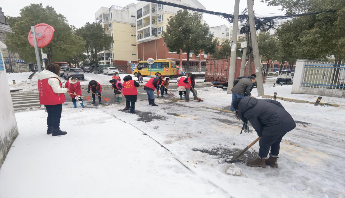 新华社区“奶奶护苗志愿服务队”在东方红小学门前铲除道路上的积雪积冰。大家一字排开,铲的铲撮的撮,边除雪边热情喜气地交流。经过大家2个小时的努力,学校正门的一条道路上坚硬的积雪积冰被彻底清除干净。