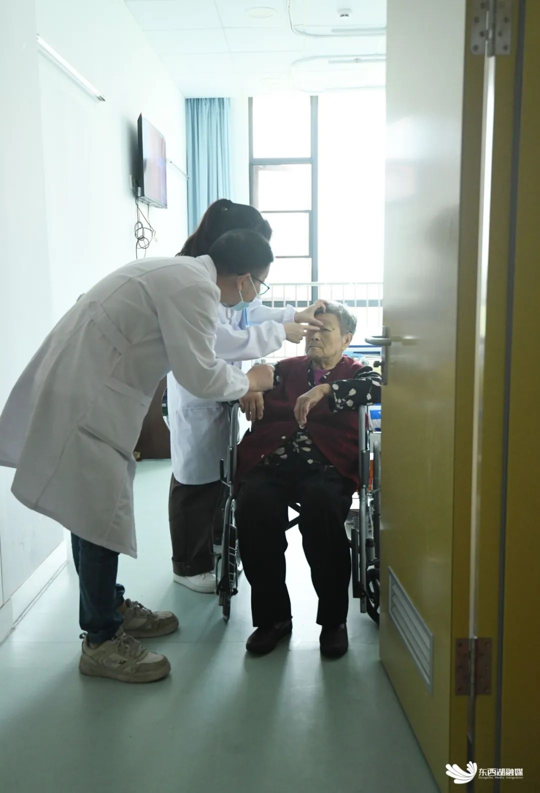 值班医生为卧床老人检查身体。
