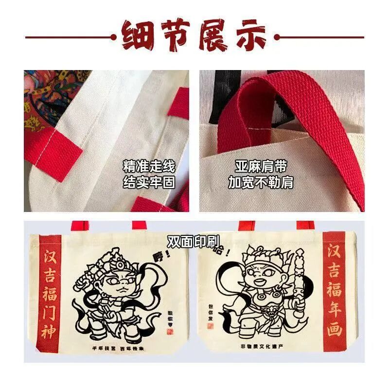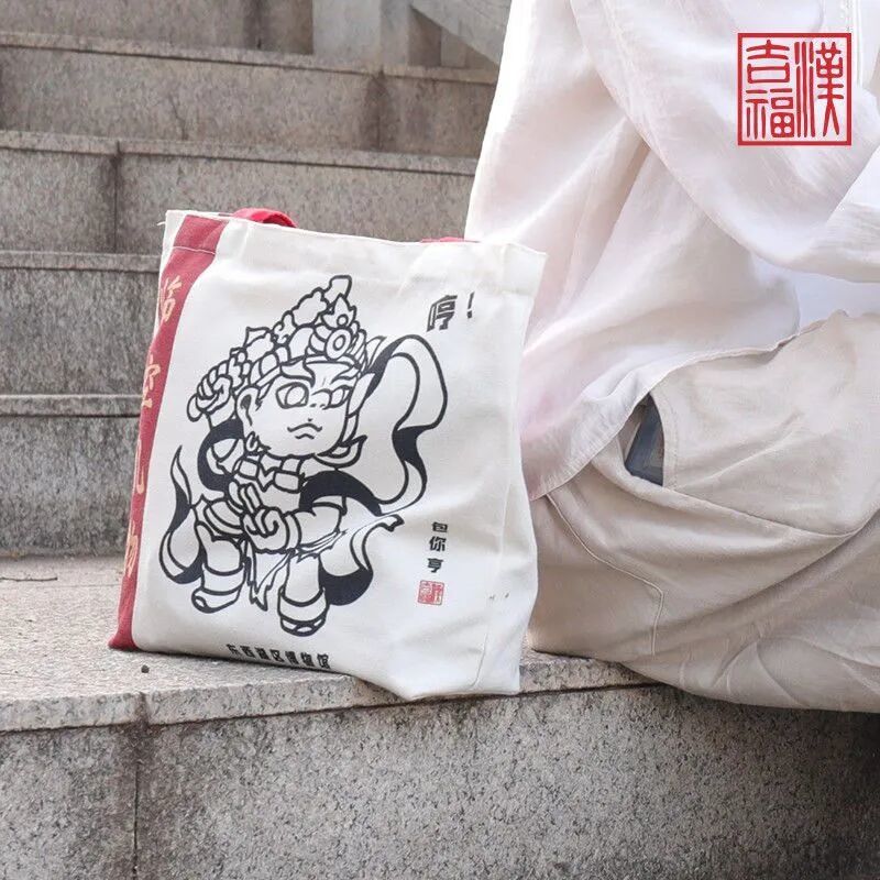 汉吉福团队对传统年俗文化中的门神形象进行了现代化演绎,将传统人物改编为Q版形象并开发成文创产品,哼哈二将帆布包便是其中之一。帆布包上印有俏皮可爱的Q版哼哈二将形象,色彩鲜艳,造型生动,既保留了哼哈二将的神韵,又增添了几分萌趣,符合当代年轻人的审美。