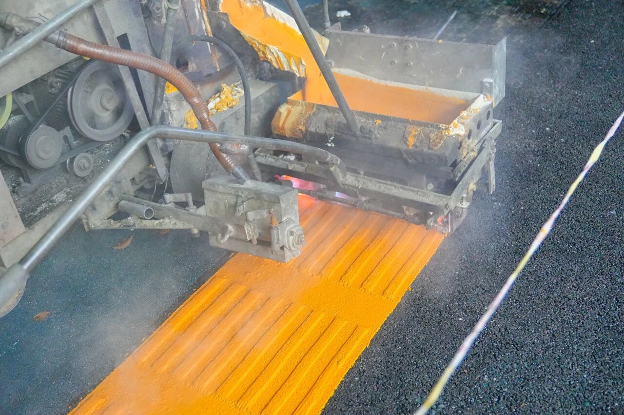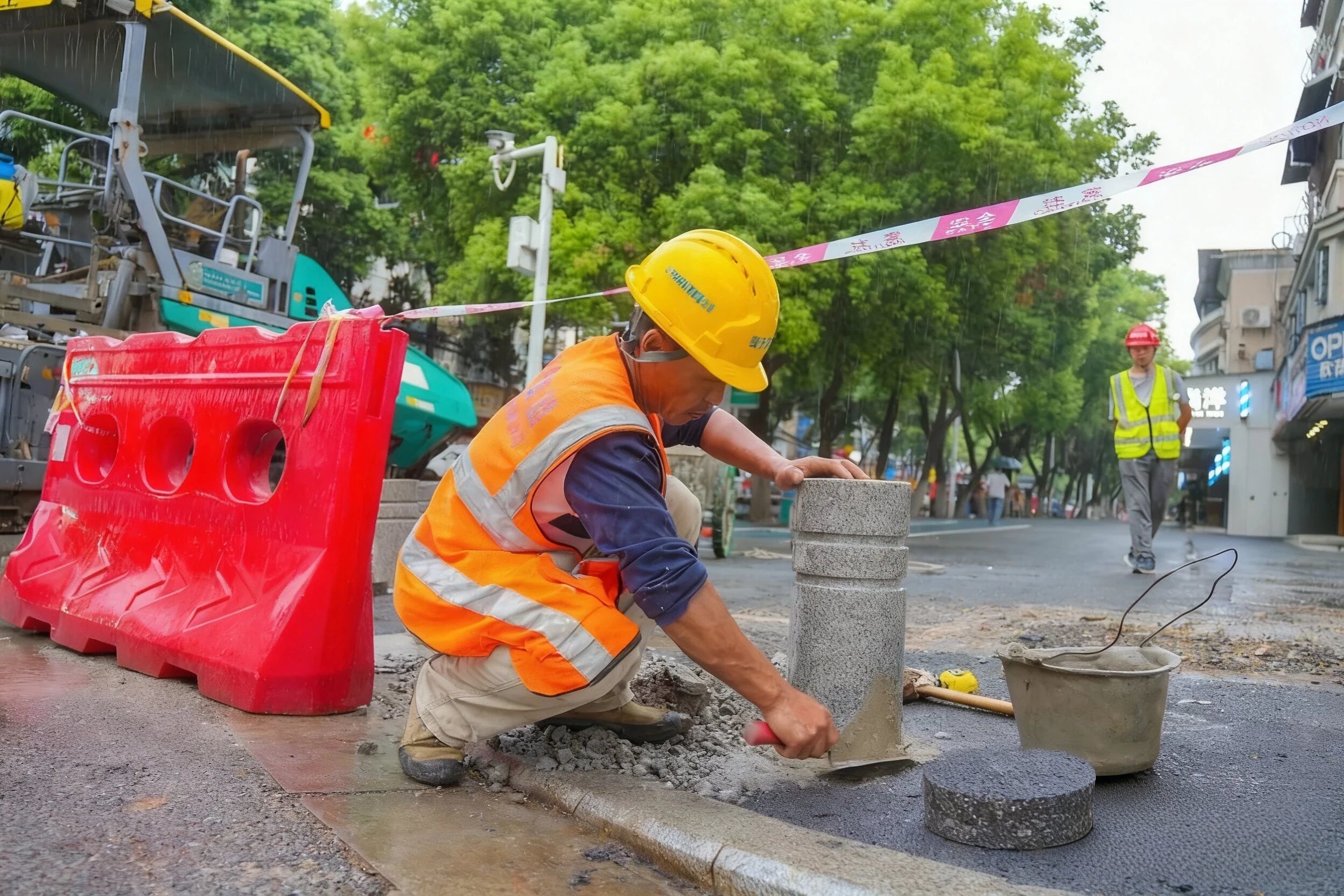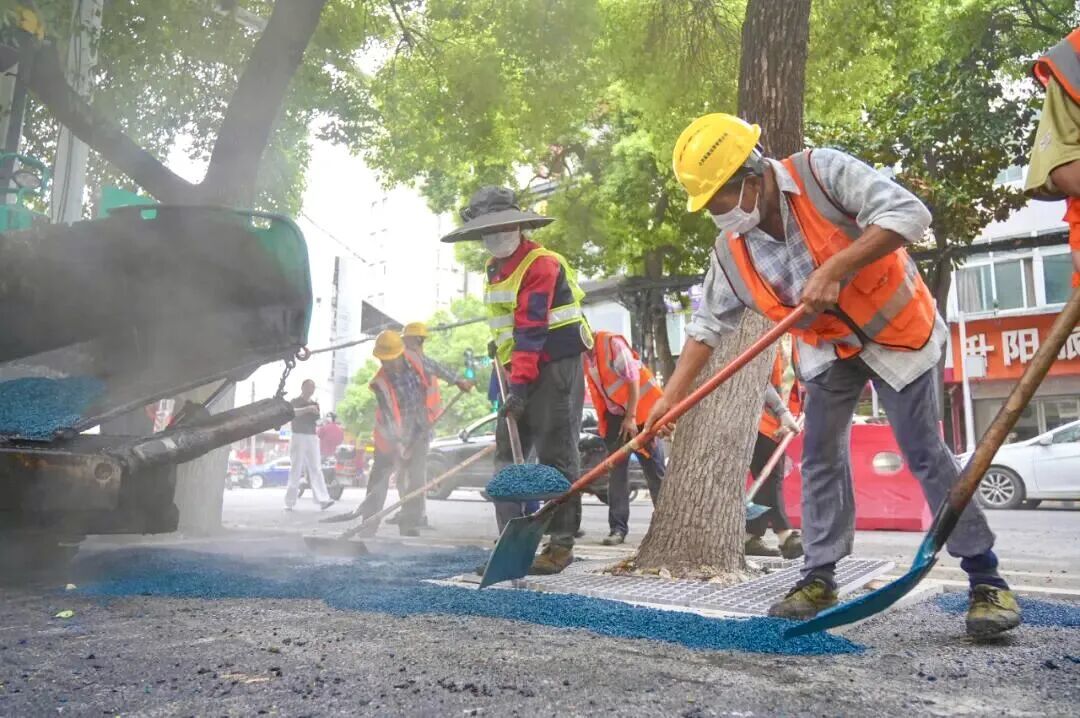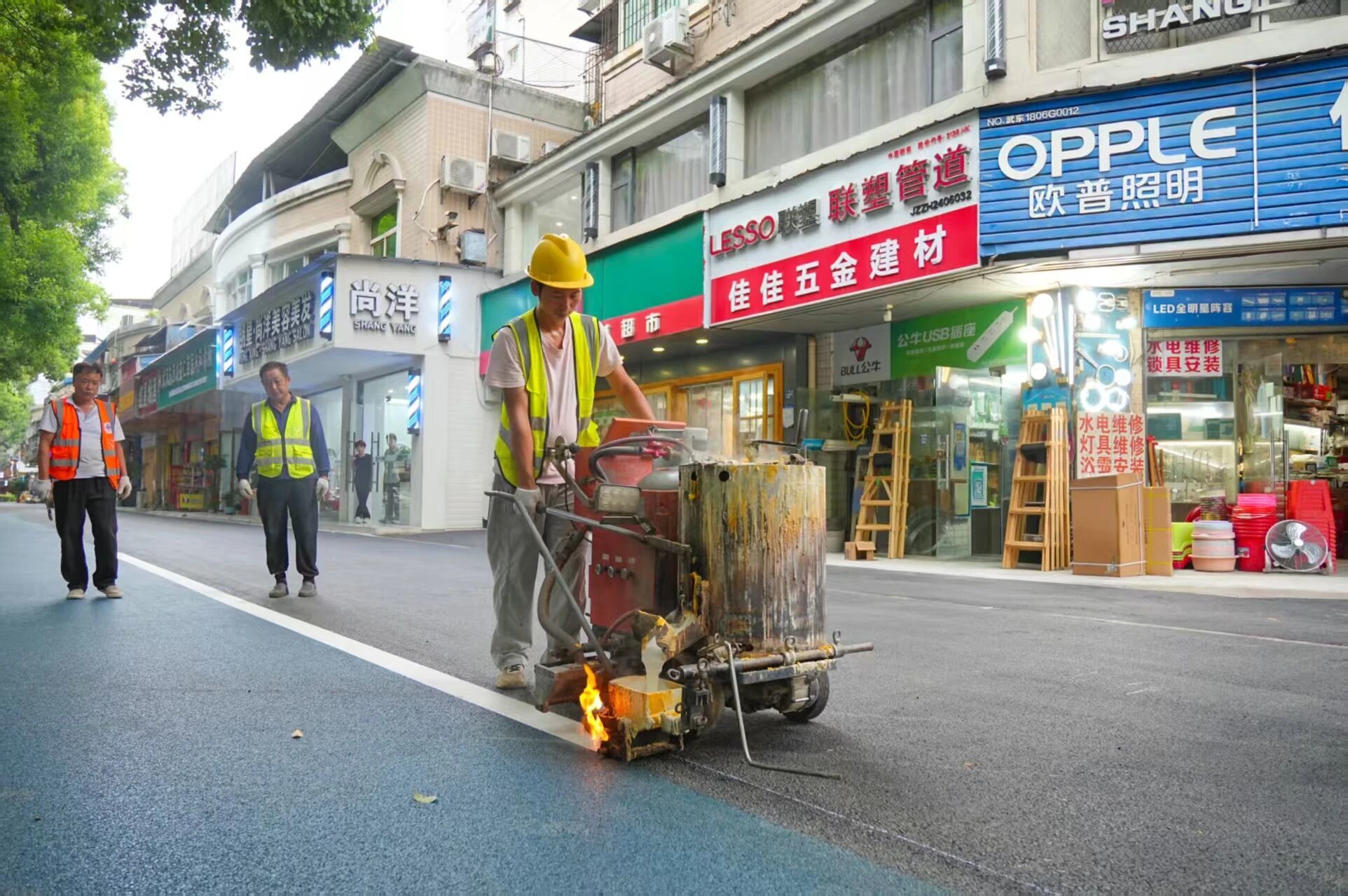 4700平方米的旧地砖全部拆除后,施工队铺上了彩色沥青——人行道用黑色,非机动车道用醒目的酞青蓝,两种颜色通过白色标线清晰分隔,同时在盲道的施工中摒弃传统砖材,创新采用无机高强聚合材料,实现“现浇即用”,有效减少施工对行人的影响,实现降本增效。