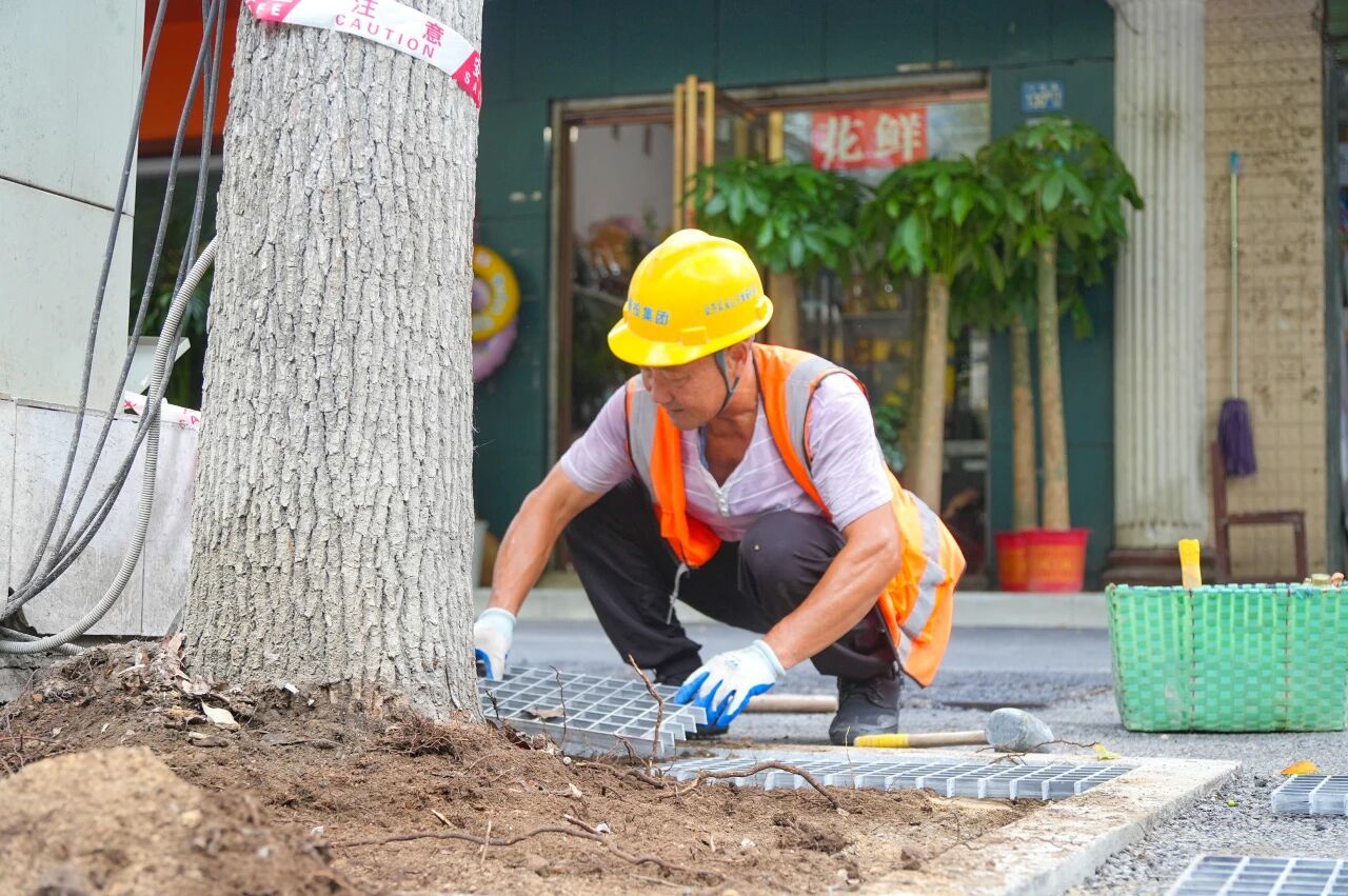 最先开始的是地面改造。旧人行道的地砖已经使用了三十多年,不少砖块松动翘起,下雨天踩上去就会溅起泥水。施工队先用小型破碎机把旧地砖一块块凿下来,然后下挖埋好雨污管线,再浇筑夯实35厘米厚的混凝土。“这里的横向坡度要控制在1.2%,比设计要求再高一点,雨水能更快排走,商户门口就不会积水了。”市政环卫公司的项目经理冷程才现场介绍说。