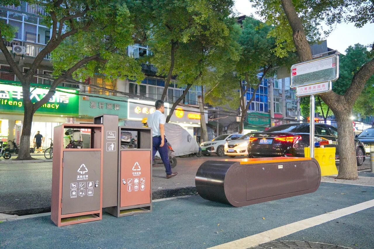 改造过程中,细节里的暖心设计随处可见。考虑到老年人买菜方便,施工队在菜市场入口处设置了无障碍坡道;为了规范车辆停放,新增了500个非机动车停车位和319个阻车桩;此外,新增了7处分类果皮箱,并在4个公交候车站旁设置环卫工具椅,既方便存放环卫工具,也供候车行人休息;沿街商铺的72个空调外机统一安装了空调栅栏;就连路边的变电箱,也被涂上了彩绘,和周边的老街区氛围相得益彰。