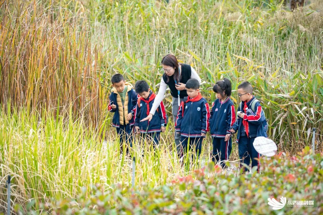 空港湿地花田自然教育基地里,孩子们在指导老师讲解下认识水生植物。