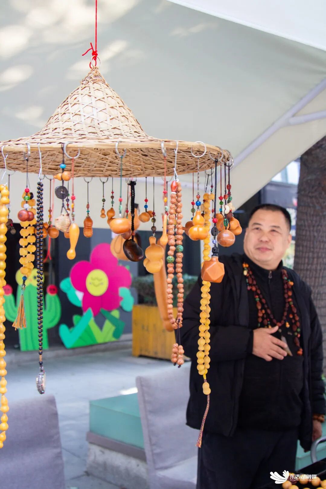 丁玉成的摊位摆满了烙画葫芦,形态各异的葫芦上,被精心烙印着山水花鸟、吉祥瑞兽等图案。它们被设计成了挂饰、手串、手机链等配饰,深受年轻人喜爱。丁玉成说,这次通过市集结识了许多年轻消费者,通过和他们交谈,了解到了市场的偏好,这对他未来的经营方向有了许多启发。