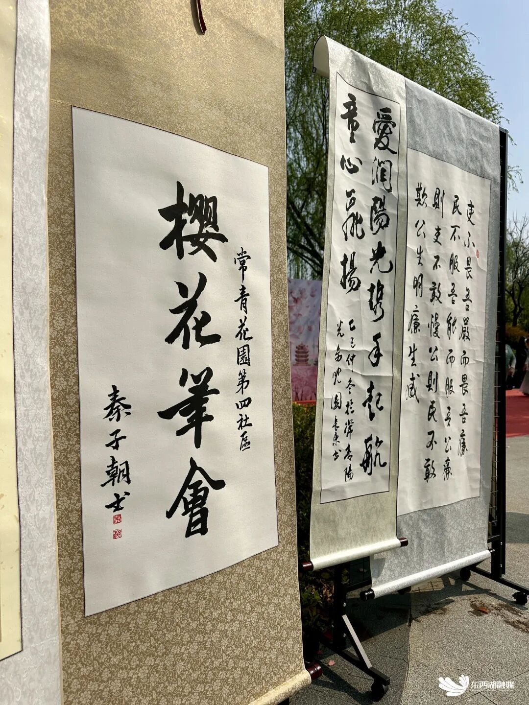 不远处,一幅刚健有力的书法作品同样引人注目。作者秦子朝是一名在校大学生,他的爷爷曾参加第一届樱花笔会。十多年过去,秦子朝的作品与爷爷当年的“同门”作品隔空对话——笔墨之间,传承不言自明。