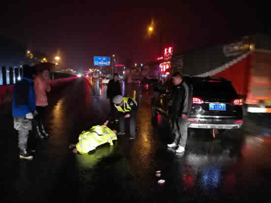 2月7晚7时许,武汉出现雨夹雪天气,气温降至零度以下。此时,武汉市东西湖区走马岭集镇45岁居民胡某横穿107国道武汉市东西湖区走马岭路段时,一辆路过此路段的越野车将胡某撞倒在国道路面上,胡某当即头部受伤而昏死过去。武汉市公安局东西湖区分局交通大队一中队民警杜子华等人接到群众报警后,立即赶到事发现场进行处置。