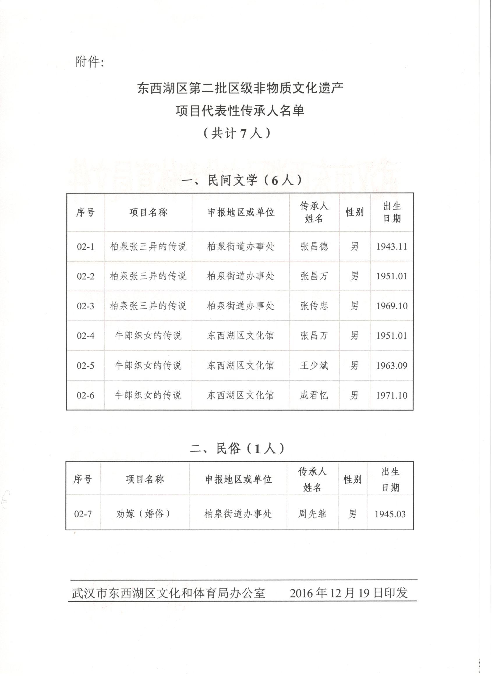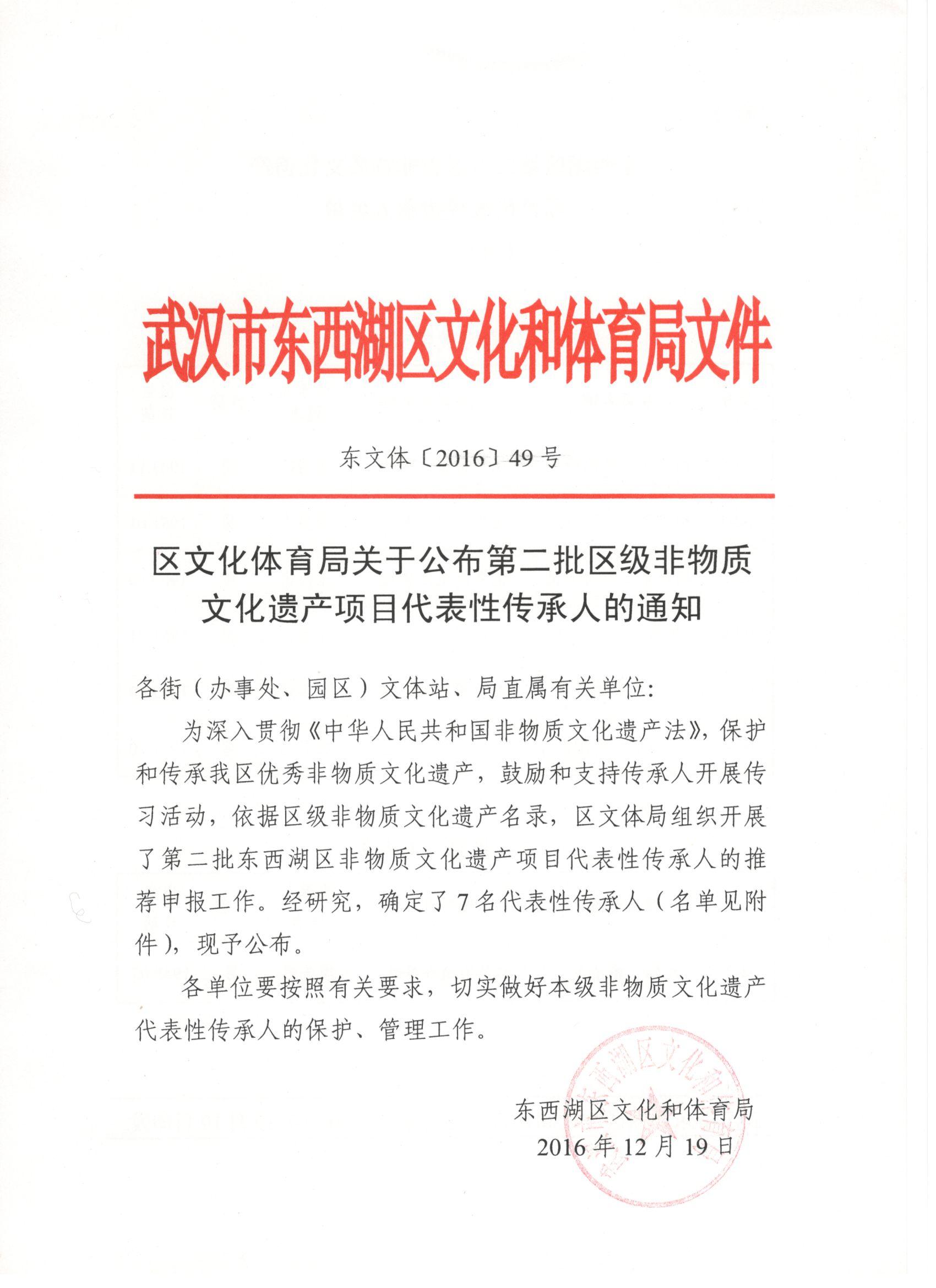 区文化体育局关于公布第二批区级非物质文化遗产项目代表性传承人的通知