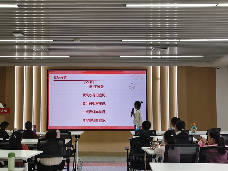 “水始冰,地始冻,雉入大水为蜃……”6分钟动画短片带领孩子们云游南北,了解了立冬气候特征与“北饺子、南汤圆、冬季滋补养生”等习俗。随后,两位“领读小助手”登台,带领全场齐诵李白与王稚登的《立冬》诗篇,在诵读中把古诗“读成有节奏的雪花”。课堂最后,10道趣味抢答题点燃全场,“立冬是第几个节气?”“立冬我们要注意什么?”孩子们纷纷举手抢答,秒变“立冬小学霸”,在互动问答中巩固了节气知识。