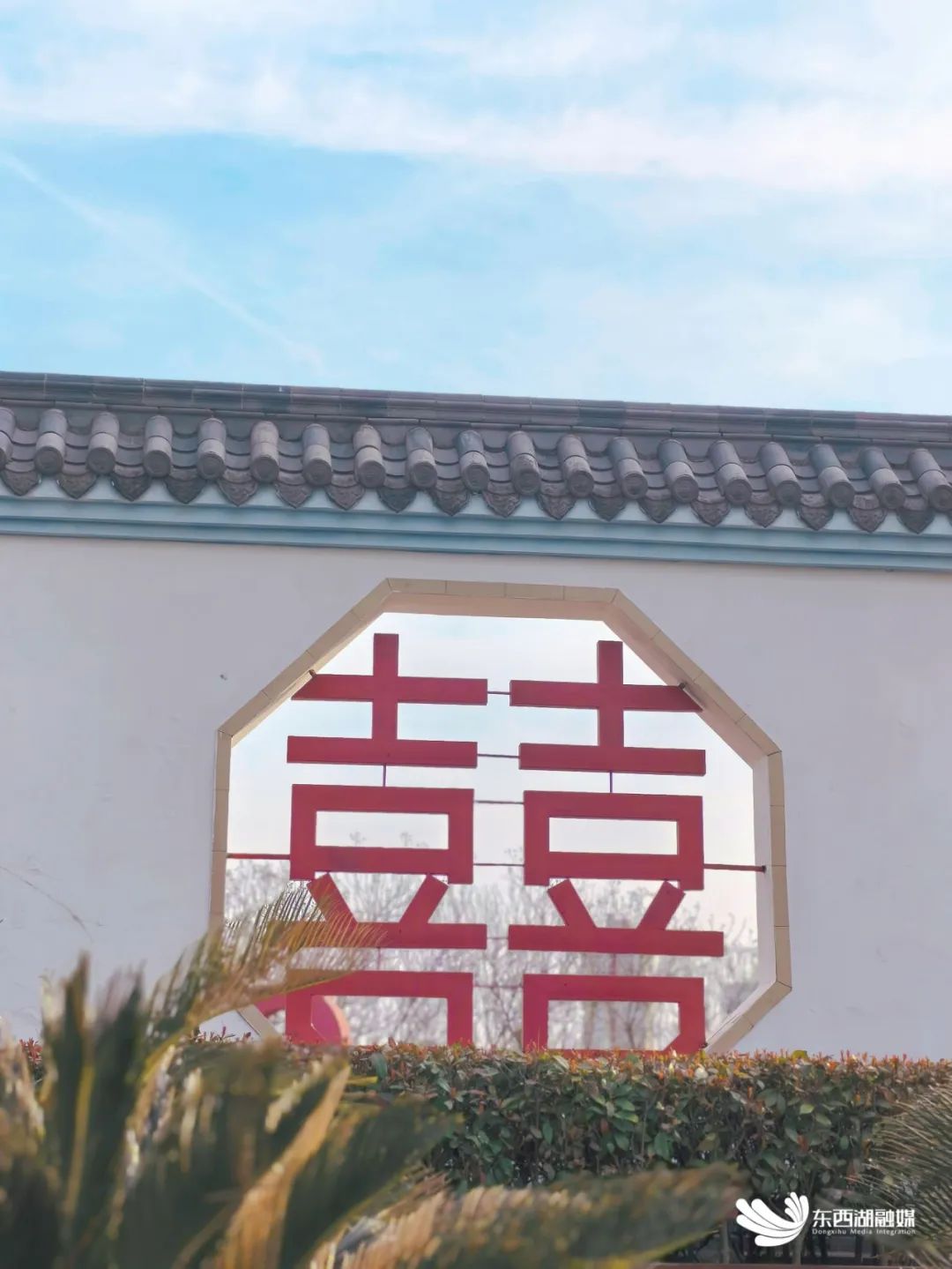 大红色爱心和囍字装置,专为情侣拍照打卡。这个季节,汉江堤边有初开的石榴花,还有鸢尾花、南天竹、银杏树等花卉绿植。