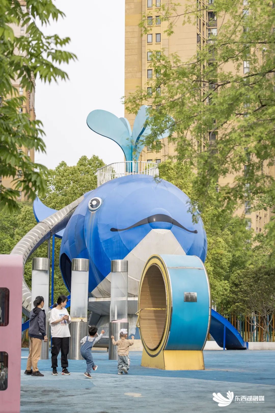 明亮的蓝色大鲸鱼,拍照很出片。高6米左右的呆萌蓝色大鲸鱼带有2个攀爬网,“肚内”有多个滑梯。登顶鲸鱼背部,还可以体验超大旋转滑梯。