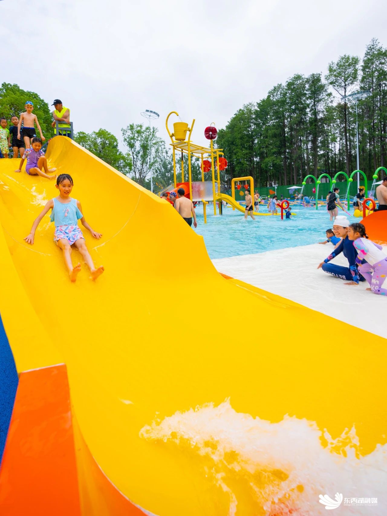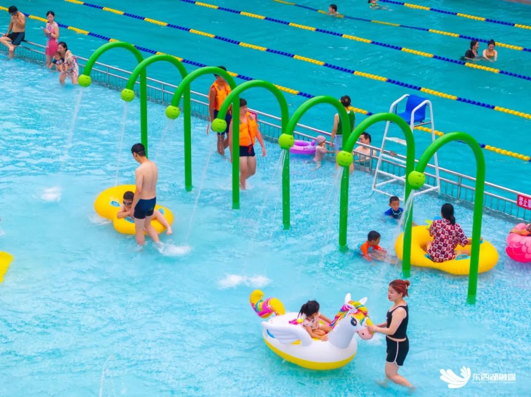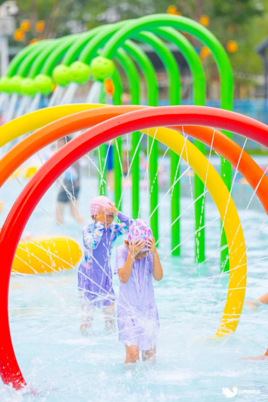 另一边的儿童戏水池“童”气爆棚,小朋友们在游乐设施里爬上爬下,有些打着水仗,有些泡在水里享受清凉。一排绿色豆芽状喷淋器特别吸睛,在喷头下冲个凉水澡,无比惬意。儿童戏水池还免费提供水上卡通充气坐骑,为小朋友们增添更多欢乐。