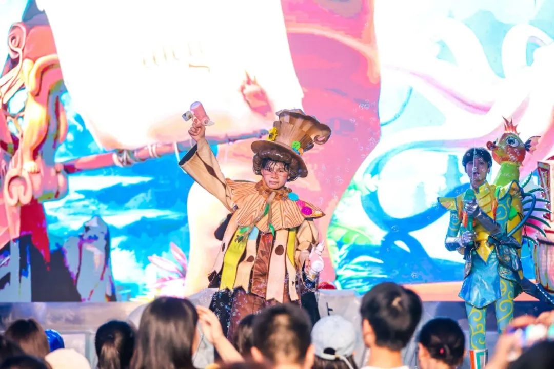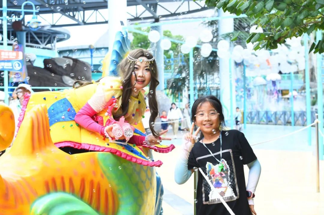 欢乐舞曲响起,海洋泡泡舞会隆重开场。进入梦幻的泡泡世界,可爱的海底小动物们手拿小水枪和现场游客们“清凉互动”。