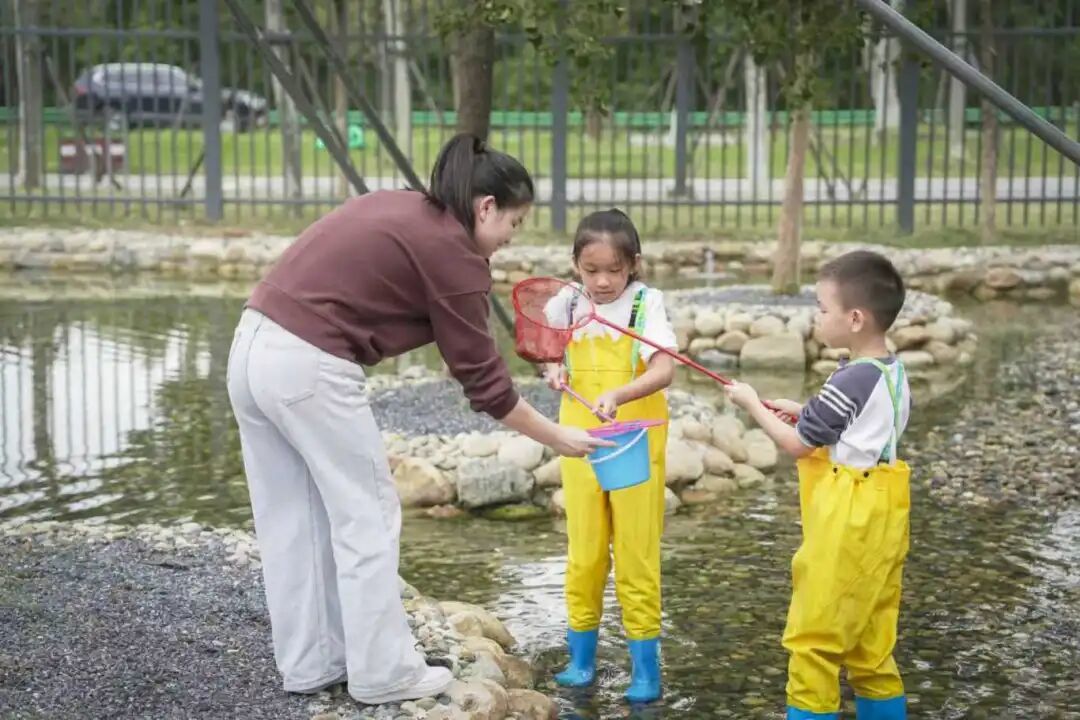 走进“浪潮宝藏乐园”,超过1000㎡的天然感溪水池映入眼帘,上百吨鹅卵石铺底,树木自然生长,流水声淙淙不绝。孩子们卷起裤脚跳进池中,摸鱼、捞虾、追螃蟹,欢声笑语不断。家长们也忍不住俯身一同捕捉,仿佛回到童年暑假在老家的河边玩耍。