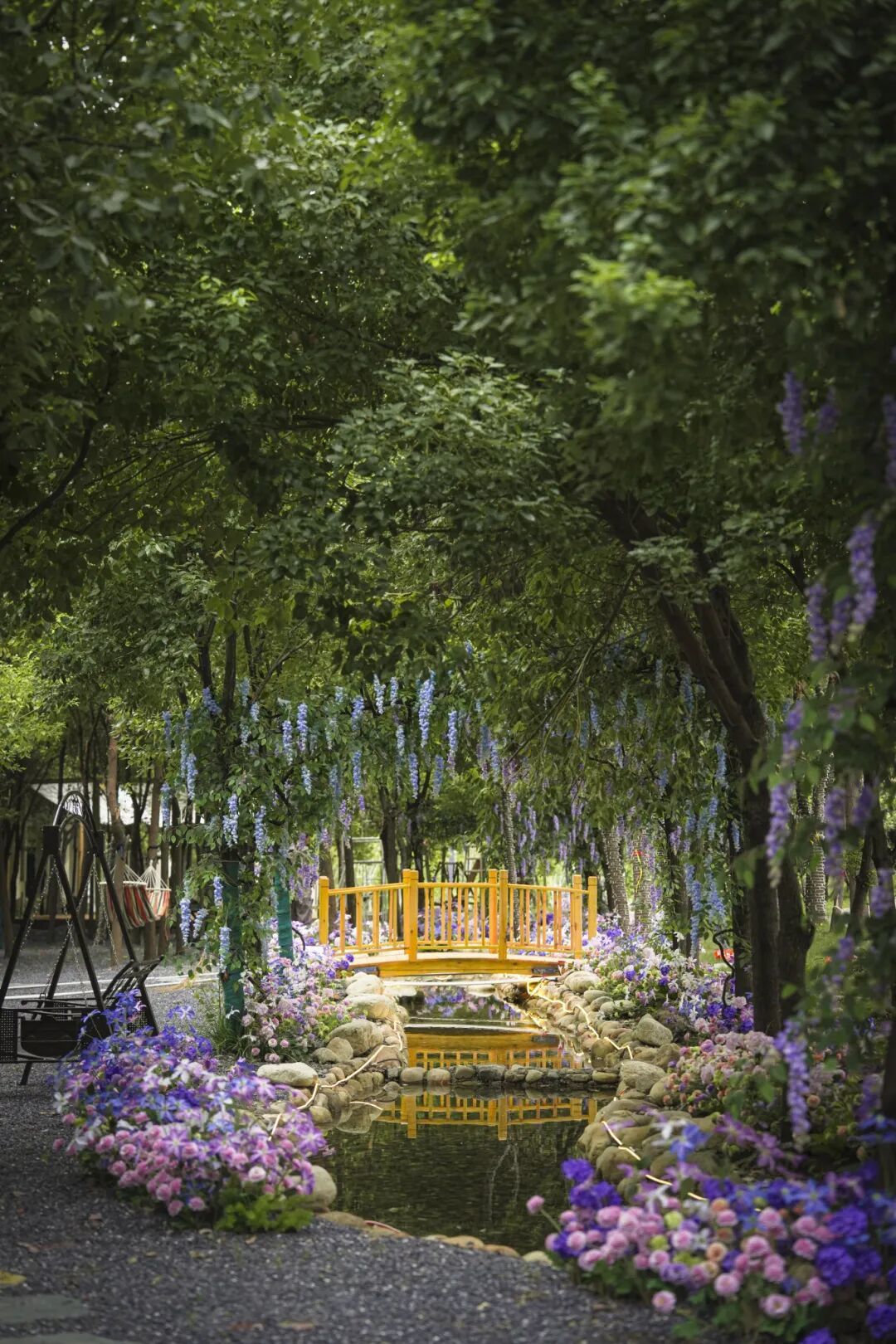 一旁的“叮咚冒险溪谷”雾气缭绕、紫花环绕,小桥流水搭配雾森系统,宛如踏入爱丽丝的仙境——让人拍照停不下来。