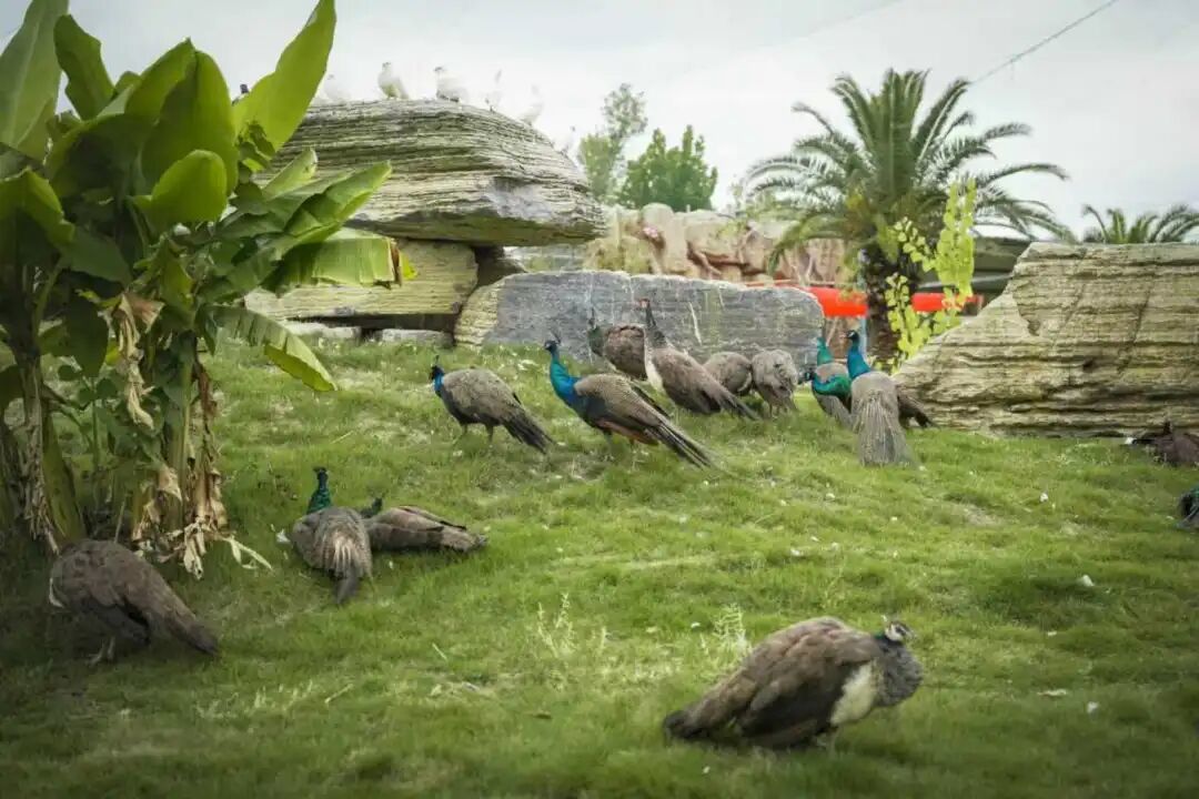 孔雀在草地上优雅踱步,偶尔展开令人屏息的蓝绿色尾屏;鹦鹉站在木质指示牌上歪头打量来往游客;黑天鹅一家在池塘中列队游过,划出银色水痕;柯尔鸭摇摇晃晃走过草地,像一团团移动的云朵。