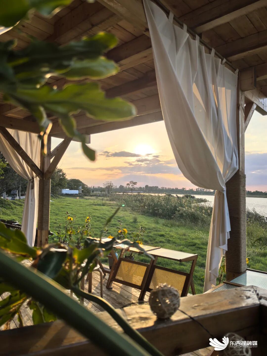 步入农庄深处,一座依托百年樟树构建的二层观景建筑跃入眼帘。巧妙的设计使建筑与古树共生,环树而建的观景平台,确保每位访客都能无障碍欣赏巨龙湖日落胜景,因此被游客亲切称为“落日收藏馆”。
