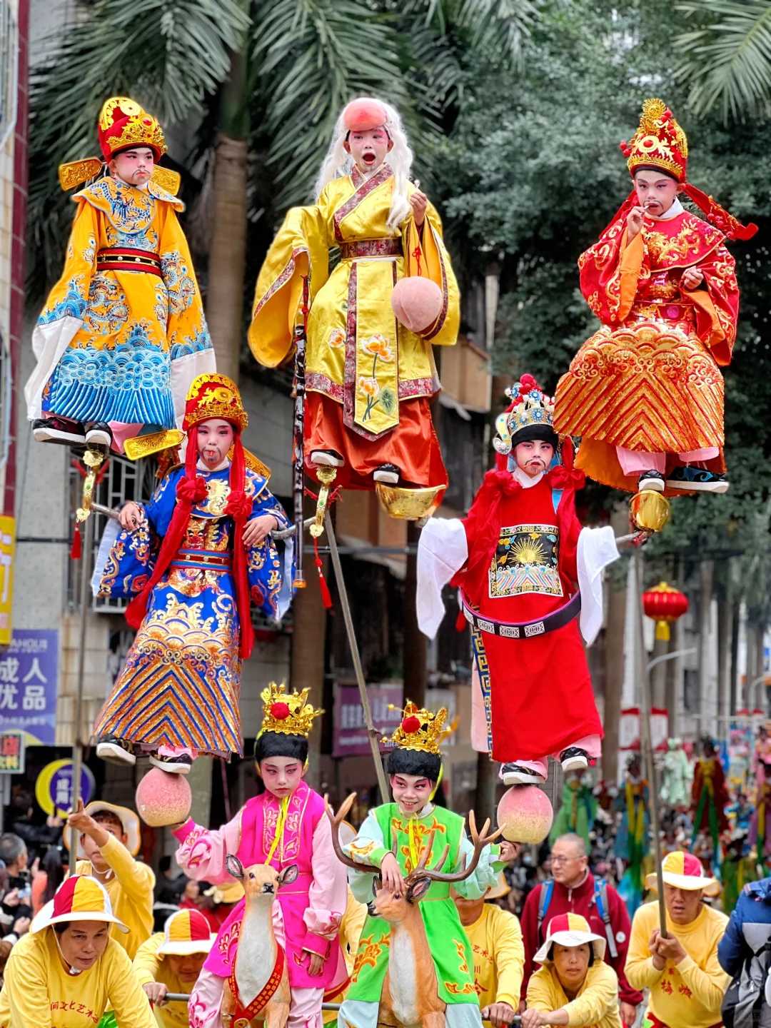 非遗“飘色”,起源于春秋战国时期的抬阁艺术,是融戏剧、杂技、舞蹈、美术与音乐于一体的传统民间游艺。精心设计的“色梗”支撑起装扮成神话人物的孩童,让他们悬于空中,远观如仙童踏云而行。